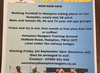 Walking Football sessions has started at Hampton Rangers for everyone in the 50, 60 and 70 year old age groups. Come and try it - its great fun, meet new people, and improve your health and wellbeing at the same time. Sessions take place every Friday at 3pm on our new 3G pitch, just turn up or contact Hampton Rangers for more information. The first month is free (small charge thereafter) and tea and coffee will be provided. We're planning to start a further 7pm session in the coming weeks as well. Come and join us.