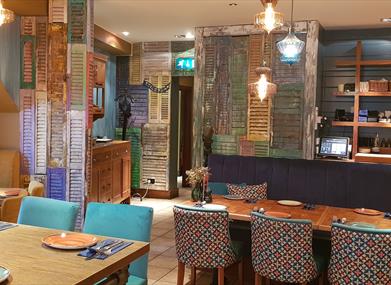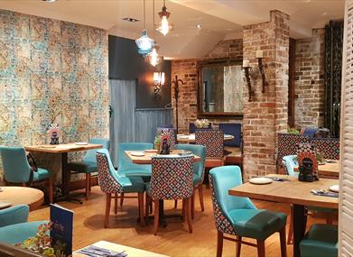 The dining area has tables for 2 and 4 as well as banquette seating and tables for groups with a raised area at the rear, perfect for larger parties.