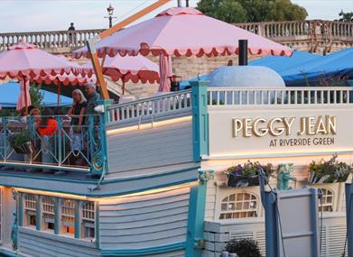 Peggy Jean, our lovingly restored former Jesus College Oxford barge, enjoys unparalleled views of the Thames, Richmond Bridge and Richmond Riverside.