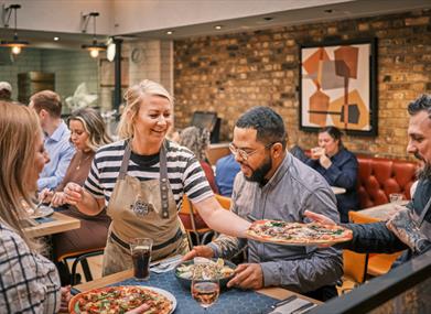 Come and see us in the leafy London suburb of Teddington, on Waldegrave Road. You’ll find us in what used to be the old Horse & Groom pub, still with the original tiled walls outside and large windows overlooking the park opposite. Inside, there’s an open kitchen where you can watch our talented pizzaiolos plate up PizzaExpress favourites, like Dough Balls or the ever-popular Padana, from the comfort of intimate booths or high tables. We’re located just off the high street (perfect for a spot of shopping after lunch); a 4-minute walk to Teddington train station, where you’ll find good transport links into Central London.