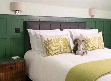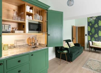The Bushy Park inspired apartment is a uniquely designed suite with a soothing green colour scheme, a generous bedroom with king-sized bed, and a spacious living and dining area. A large sofa bed offers additional sleeping for younger members of the family.