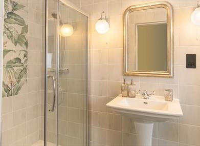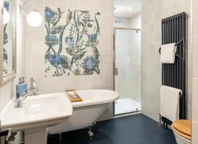 The large bathroom features a delightful roll-top bath and walk-in shower, creating a feeling of serenity and relaxation.